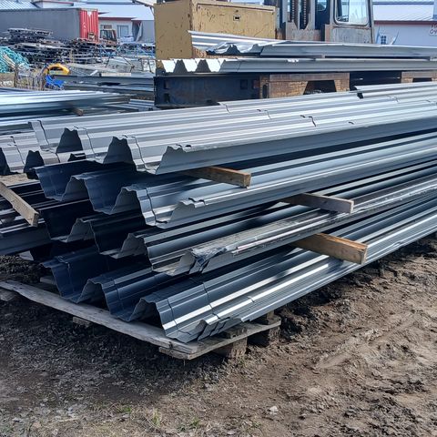 Itsekantavia kattopeltejä,pisimmät jopa 12 metrisiä,pellin paksuus näissä pitkissä 1,2mm,profiilin korkeus 13 cm,hyötylevey5 cm..