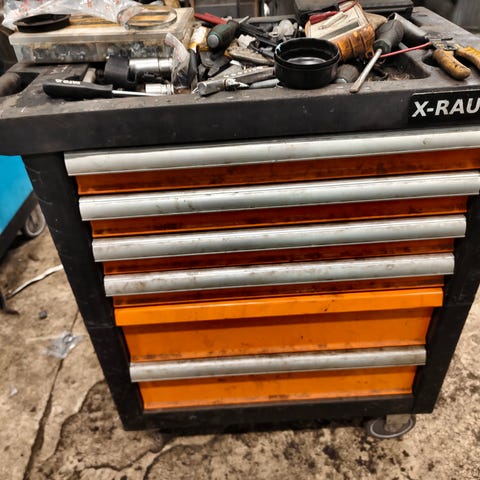 Korkea työkaluvaunu ja työkalut. K 1550, L 720, S 300. Hinta 190