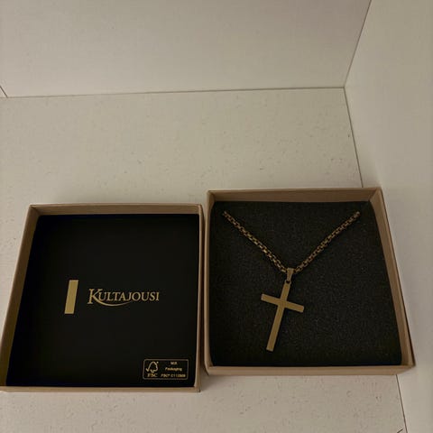 Police teräs kaulakoru risti, musta kuvi ei tietoa mikä on ja sormus roomalaiset kirjaimet