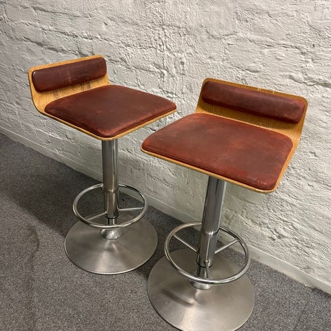 Retrohenkinen Venetsiatuolin baarijakkaraversio. Valkoinen nahkapäällinen. Käsinojat ja jalkatuki.