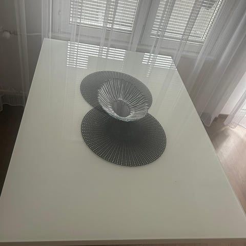 Myydään Kodin 1 ostettu ruokapöytä. Halkaisija 180 cm, pieni pala irronnut, siitä kuva.