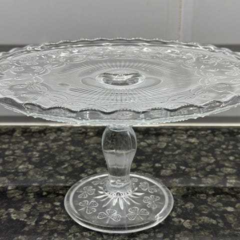 Kerttu Nurmisen Nuutajärven lasille suunnittelema Apila-sarjan jalallinen kakkulautanen. Sarjaa oli tuotannossa vuosina 1977-85. Lautasen halkaisija on 25,5 cm ja korkeus noin 15 cm. Kakkulautanen on ehjä, naarmuton ja hyvässä kunnossa.