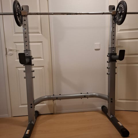 Ei ole tämä setti paljon käytössä kulunut. Power rackista jouduin natsaamaan 5 cm pystytankojen päistä että sain talliin mahtumaan. Myydään settinä.