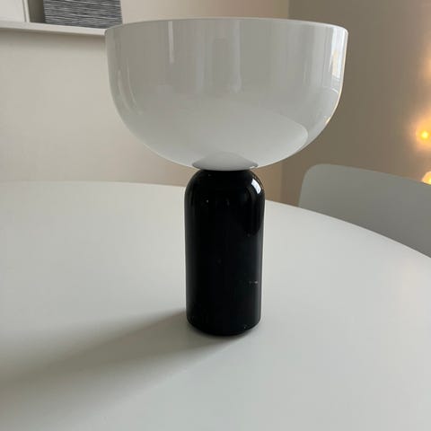 New Works -merkin pöytävalaisin veistoksellisella, kannettavalla muotoilulla rohkeilla muodoilla. Siinä on soikea lampunjalusta marmorista puolipallon muotoisella lampunvarjostimella akryylista.