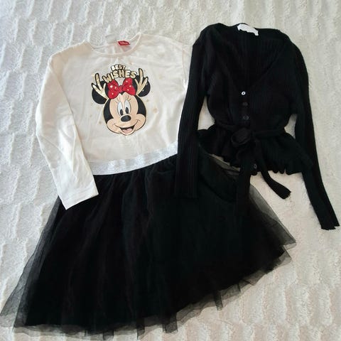 Settiin kuuluu Daisey t-paita (122-128), pinkit leggingsit (134), Minnie -korvat ja farkkutakki kokoa 140cm. Nouto Myllypurosta tai pk 6.80€