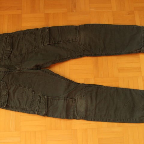 H&M:n siistikuntoiset mustat reisitaskuhousut liukasta, paksua, himmeästi kiiltävää satiinipintaista kangasta, 140 cm. Etutaskun kohdalla aivan pieniä pisteitä, joissa kankaan lanka ottanut johonkin kiinni, näitä tuskin huomaa. Säädettävä vyötärönauha.