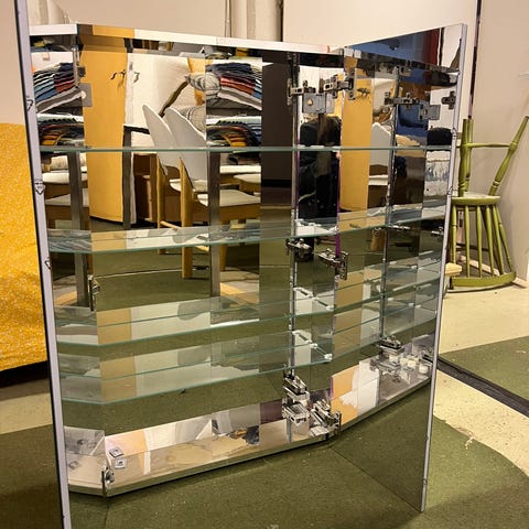 Valkoinen peilikaappi, kahdella hyllyllä, vaihtuu kahvipakettiin.
