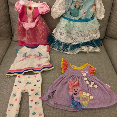 Myydään Baby born vaatteita. Leikeissä hieman jo kulahtaneita mekkoja ja pusero ja housut. Ruusumekko ei ole Baby born merkkiä mutta mahtuu nukelle kyllä. Vaatteet ovat ehjiä, mutta kuvioissa näkyy pientä kulumaa (kuvat) ja pientä pintanukkaa mekoissa. Housut ovat ehjät ja hyväkuntoiset.