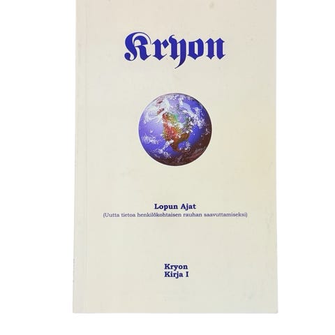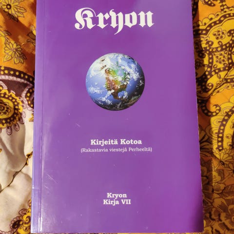 Kryon Matkalla kotiin kirja. Alleviivauksia ja merkintöjä. Etukannessa ohuita taitoksia ja paperin pinta irronnut pieneltä alueelta vasemmasta yläreunasta