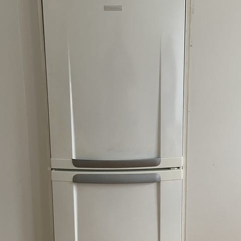 jääkaappipakastin valkoisella värillä. Kylmälaitteessa on erillinen jääkaappi- ja pakastinosasto. Sisältää useita hyllyjä ja laatikoita säilytystarpeisiin.