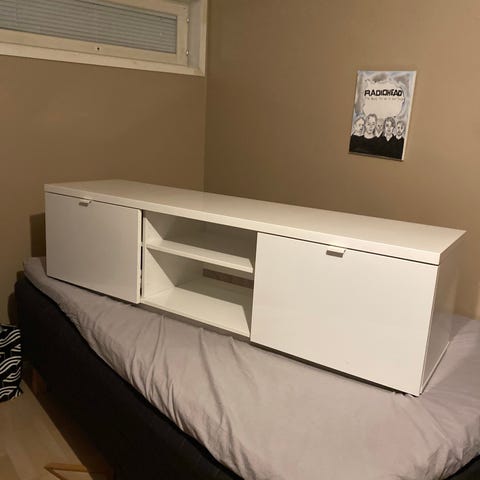 Valkoinen hyväkuntoinen TV-taso liukuovilla.