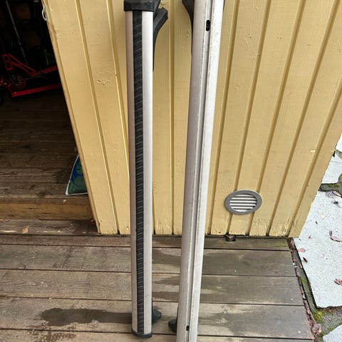 Kuvan mukaiset Audin alkuperäiset wingbar-tyyppiset kattotelineet B9-korille Audi A4 Avant / farmari (vm2015->). Avain mukana.