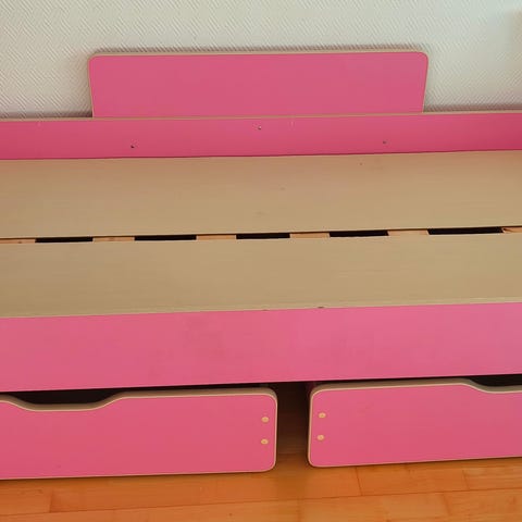Sänky 180 × 80 ja sängyn kaksi vedettävää laatikkoa.