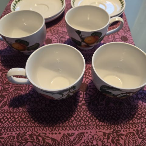 Pomona Portmeirion mukit 6 kpl yht. 60€. Teekannu 30€.