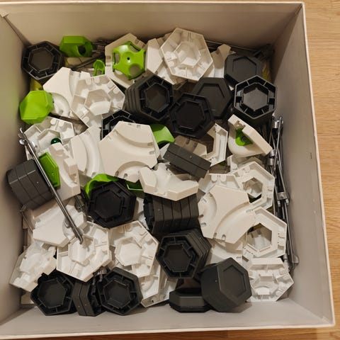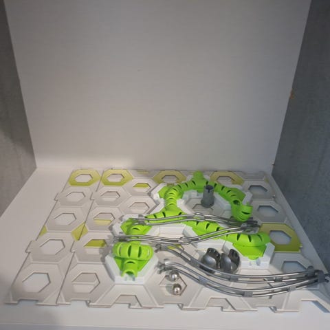 Gravitrax Pro Aloituspakkaus Vertical on laadukas kuularata. Tämän pakkauksen sisältö on täydellinen, jos laskin oikein. Sisällyksen löydät kuvasta 3. Reunoilla hiukan kulumaa, mutta sisältöhän on tärkein. Kannattaa säilyttää ehkä jossain laadukkaammassa laatikossa.