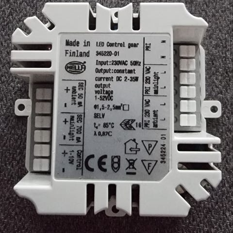 Highline Maxi Dim sähkötarvike, jossa on erilaisia liitäntä- ja ohjausmahdollisuuksia. Tuotteen tekniset tiedot ja liitäntäkaaviot näkyvät pakkauksessa. Soveltuu sähköasennuksiin ja valaistuksen ohjaukseen.