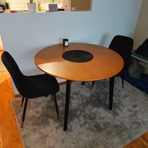 Pyöreä valkoinen ruokapöytä ja neljä tuolia puujaloilla