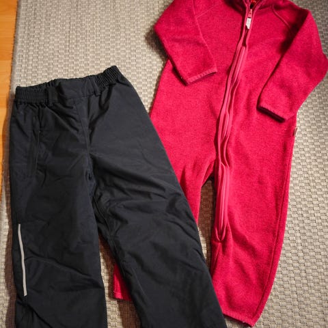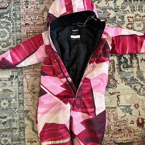 Kuvan Reimatec-toppahaalari, jossa on nepparikiinnitteinen huppu ja sivutaskut. Koko 98 cm. Jonkin verran käytetty, mutta ehjänä säilynyt.