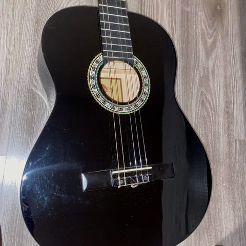 Musta, Rock On merkkinen kitara. Erinomaisessa kunnossa muuten, mutta yksi kieli katkennus ja se tarvitsee vaihtoa. Myyn kitaran sillä en osaa vaihtaa kieltä. Soi kauniisti ja voin virittää valmiiksi. Mukaan 2 plektraa ja kuljetus kassi.