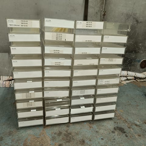 Metallinen hyllystö, jossa on neljä tasoa joita voi muokata mieleiseen järjestykseen. kuvassa siis 2 hyllyä yhden mitat 75x150x30