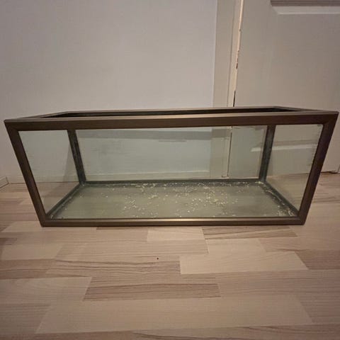 Hamsterilla ollut. Mitat noin 90x40x30. Paikattu särö kulmassa ja teipattu päädyssä, ei ole hamsua haitannut. Kunnon puhdistuksen vaatii.