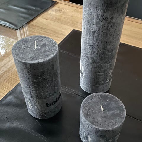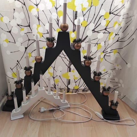 Askosta ostetut metalliset ja ’kuluneen’kullanväriset kyntteliköt. Korkeus enimmillään 39 cm.