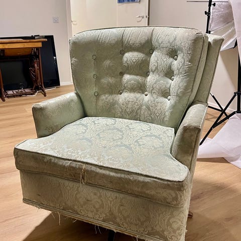 Nojatuoli ja Ikean bambuhyllykkö. Hyllykkö sopii kosteisiin tiloihin.