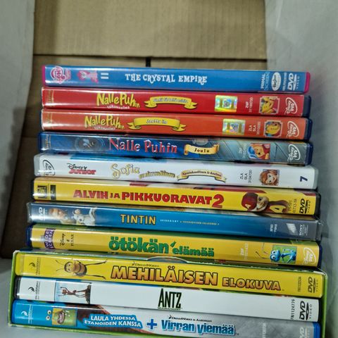 Iso läjä lasten DVD-elokuvia. Sisältävät useita animaatioita. Sopivia lapsille viihteeksi.