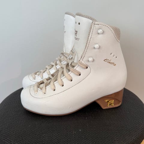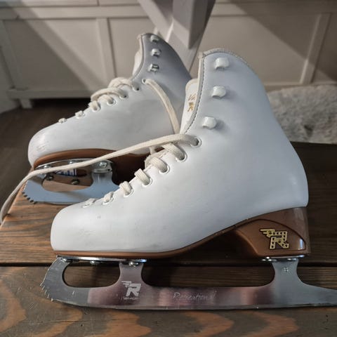 Siistit taitoluistimet. Pohjan mitta 20 cm ja terän pituus 24. Ollut käytössä 7-8 vuotiaalla. Luistimissa etuosassa ja sivussa jälkiä, mutta esim sisältä siistit ei rispaantumista. Luistimet kannattaa käydä teroittamassa ennen käyttöä.
