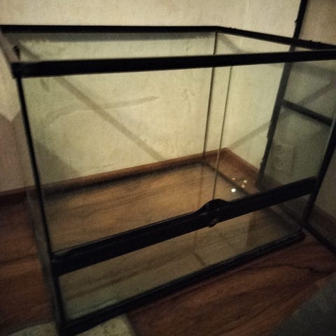 Musta mdf terraario, ollut leopardigekolla ja käärmeellä käytössä. Käytön jälkiä on (tarroja tms) mutta muuten ihan siisti ja ehjä. Saumojen välissä vähän hiekkaa jotka saa kyllä siivottua pois. Ostettu käytettynä.