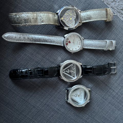 Kaksi Guess-merkkistä hopean väristä kelloa. Jäänyt laatikon perälle. Hinta yhdelle kellolle 30€ tai molemmat 50€. Paristojen vaihto jää ostajalle. N. 2012-13 ostettuja.