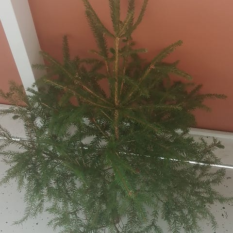 Pieni sievä maanantaina 22.12. katkaistu luonnonkuusi. Korkeus n. 110 cm. Ulkona säilytetty. Napakat oksat.