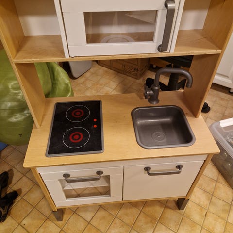 Pikkukokille oma Ikean leikkikeittiö. Käytön jälkiä on, mutta edelleen siisti. Hellan valot toimivat, patterikotelon kansi puuttuu. Mukaan söpö Ikean essu ja puinen aamiais-setti. Pieni muumisetti ja teräspannu ja ruoanlaittovälineet.