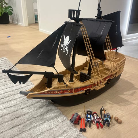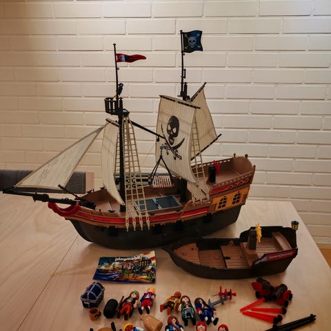 Playmobil merirosvolaiva seuraavalle leikkijälle. Mukana kolme rosvoa.