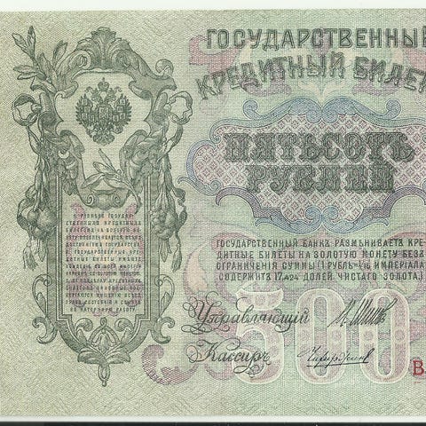 Venäjä 100 ruplan seteli vuodelta 1910. Setelissä on koristeellisia yksityiskohtia ja historiallinen muotoilu. Seteli on painettu monivärisenä ja sisältää kuvia ja tekstiä venäjäksi. Iso kokoinen 120x258 mm Allekirj. Sipov-Mets. Kulmavika vasen yläkulma, keskitaitos hinta 8 e posti 2.50 e