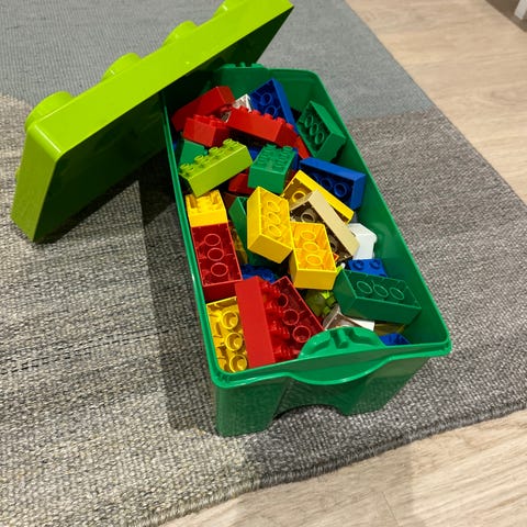 Kaksi laatikollista duploja. Sisältää paljon eläinhahmoja (mm. valas, tiikeri, panda, kani ym), lentokoneen, helikopterin, bussin, vaunuja, ikkunoita, ovia ja ihmishahmoja. Mukana myös iso rakennusalustoja. Ei pesty, eläinkoti