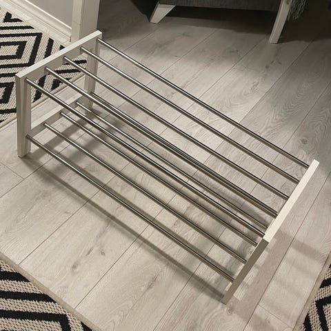 Metallinen kenkäteline. Kenkien kuivaamiseen tai vastaavaan tarkoitukseen.