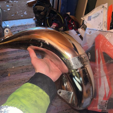 HGS valmistama pakoputki KTM EXC 125 pyörään. Ei pahempia lommoja, pinnassa pintaruostetta säilytyksestä, lähtee teräsvillalla. Ehjät kannakkeet ja O-renkaat.