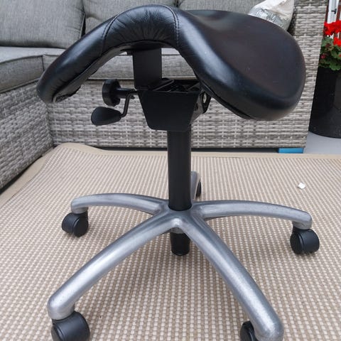 Työtuoli satulatuoli mustalla istuimella ja selkänojalla. Tuolissa on pyörät ja metallinen jalusta, joka tarjoaa liikkuvuutta ja vakautta. Sopii työpistekäyttöön. Hyvät ja monipuoliset säädöt.