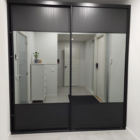 Cello-liukuovella saa helposti uudistettua nykyisen kaapiston ulkoasun. Liukuovi säästää tilaa ja luo huoneeseen aina siistin vaikutelman. Oven pintamateriaali on laadukasta kirkasta peiliä, joka luo huonetilaan avaruutta.