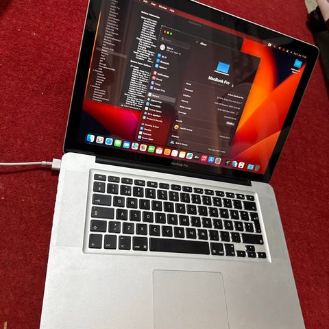 Apple MacBook Pro kannettava tietokone, hopeanvärinen. Laite sisältää näppäimistön, kosketuslevyn ja useita liitäntöjä vasemmalla sivulla, mukaan lukien USB-portit ja SD-korttipaikka.