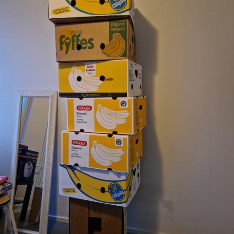 Banaanilaatikoita sekä pahvisia muuttolaatikoita. Kaikki kerralla. Vain nouto.