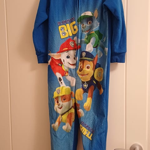Vaaleanpunainen Ryhmä Hau -haalari, jossa Halti ja Kaja. Koko 128 / 8Y. Huomaathan kuvista, että etenkin lahkeissa on vähän jotain nukkaa.