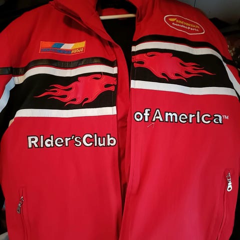 Honda nahkatakki mustaa ja punaista väriä. Takki on valmistettu aidosta nahasta ja siinä on joustavat hihansuut ja vyötärö. Takissa on Honda-logo edessä ja takana.