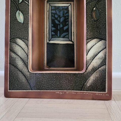 Teoksen mitat: k. 36 cm, leveys 23,5 cm. Teoksesta on pala lohjennut, joka on liimattu takaisin, näkyy kuvassa, vaikea havaita etupuolelta, huomioitu hinnassa.