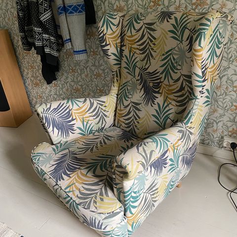 Käytetty korkeaselkäinen lepotuoli lehtikuviollisella kankaalla. Kiinteä verhoilu, istuintyyny irrallinen. Empak valmistama.