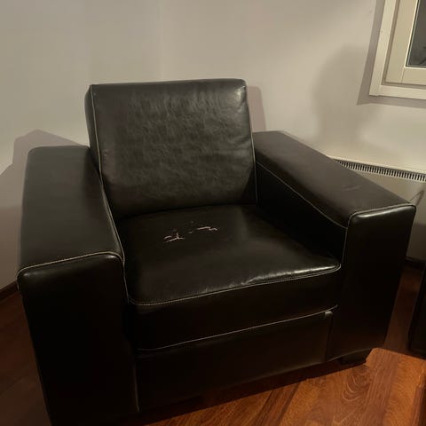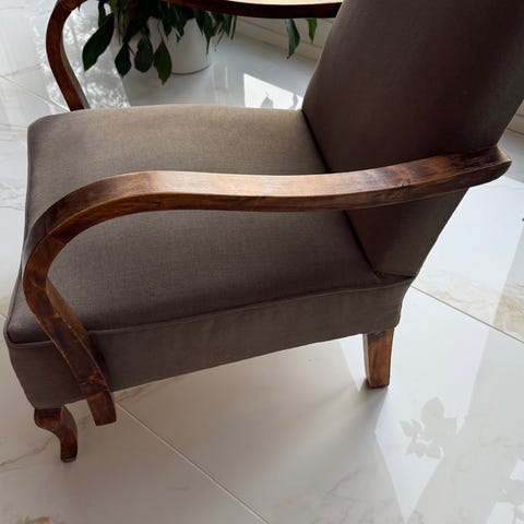 Tuolin kangas kulunut käsinojien ja selkänojan kohdalta.