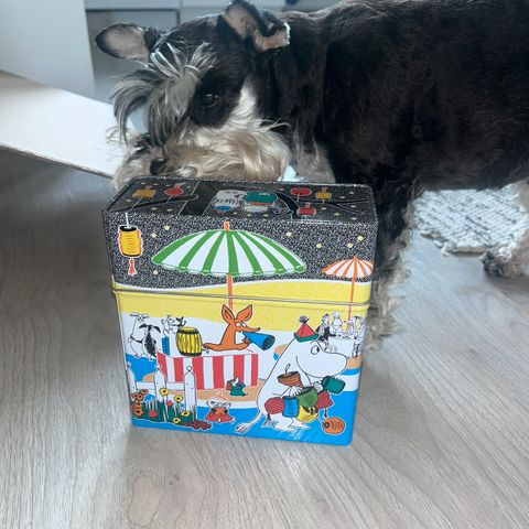 Peltipurkki Moomin Mystery box. 80-vuotis teelajitelman tyhjä peltipurkki. Purkin mitat ovat 20 x 11 x 7 cm.