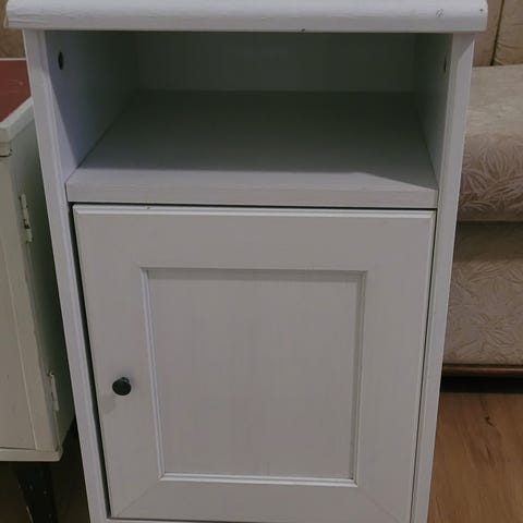 Sininen, pieni yöpöytä tai pöytätaso, yksi vetolaatikko. Kevyt kantaa.