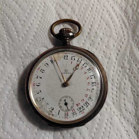 Siistikuntoinen ja hyvin toimiva vintage Omega taskukello ketjulla, 0.800 hopeaa, myös välikansi. Cal.161, serialin mukaan vuodelta 1961. Taulu ja osoittimet siistit, kopan kultaukset ok. Pitää aikaa silmämääräisesti, huolloista ei tietoa. Leveys 49mm. Nouto Lohjalta tai postit ostajalle.